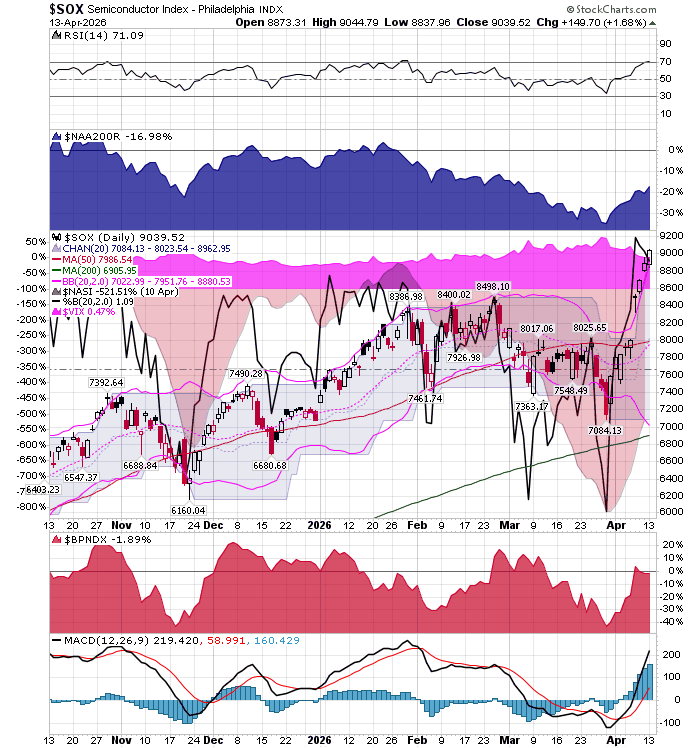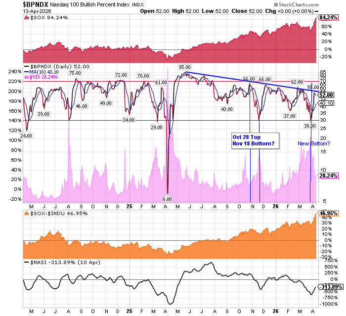 After the market closes updated data on the NASDAQ 100 and Point and Figure Data for the NDX. Also Point and Figure Data on the 30 SOX Components. An explanation of PnF Charting can be found here:
