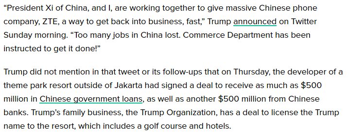 1) China invests in a Trump project. 2) Trump orders rescue for Chinese gov't-owned phone maker. 3) WH refers questions to Trump Organization, Trump's family business.https://t.co/YREMyopW5P