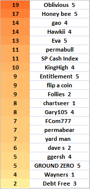 THE MARKET GURU OF THE MONTH LEADER BOARD FOR TUESDAY JUNE 26TH... IT LOOKS LIKE GURU OBLIVIOUS STILL HOLDS THE LEAD AWAY FROM HONEY BEE, STILL TWO POINTS BEHIND... OH WELL... MEANWHILE, THE REST OF THE MOTLEY PACK FALLS FURTHER AND FURTHER BEHIND, EATING THE DUST OF THE LEADERS...