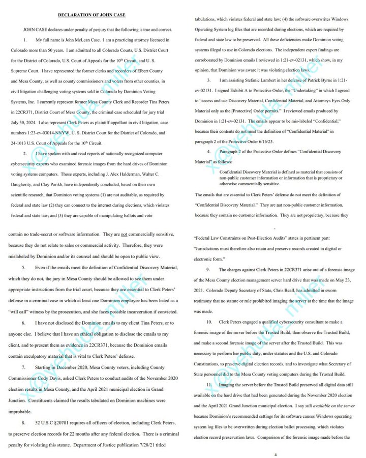 Lawyer John Case, under penalty of perjury, files declaration to Colorado Judge, stating Dominion Voting machines can connect to the internet, can switch votes, and cannot be audited.