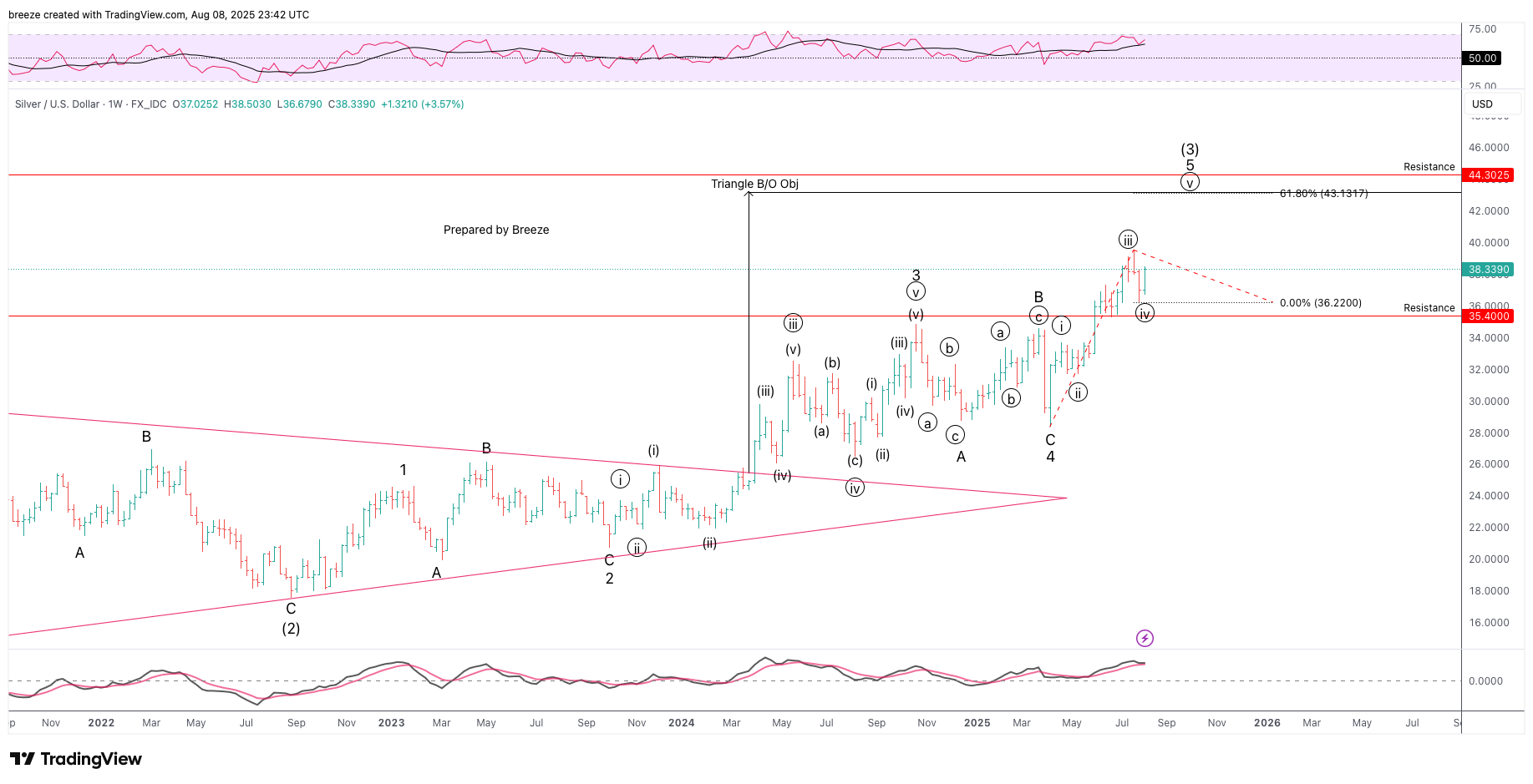 Spot Silver Wave Count Update. Minute Wave (circle) v of Minor Wave 5 of Intermediate Wave (3) is in play with a target of 43.1317. Close to the triangle breakout obj of 43.20. Breeze
