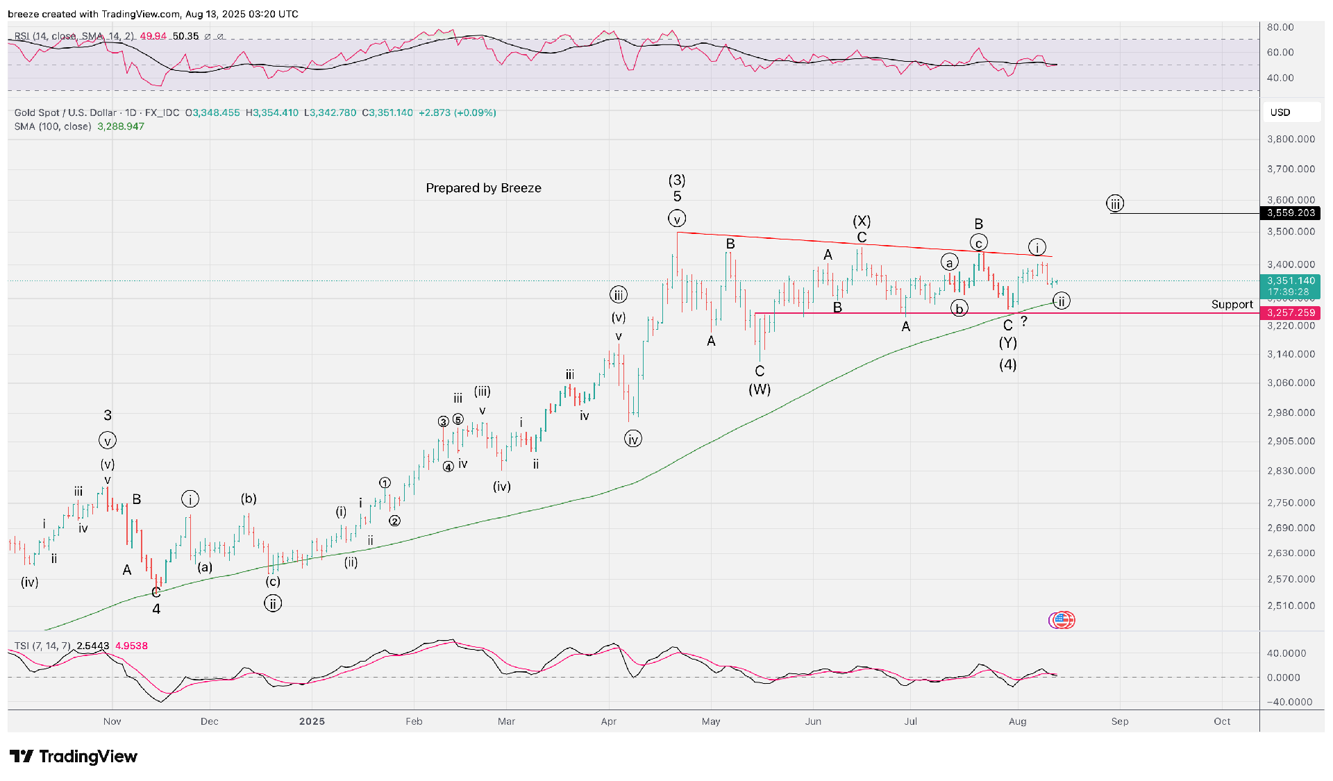 Spot Gold Wave Count Update. It appears Intermediate Wave (4) is complete. If so then an impulse wave must unfold. In this case, Minute Waves (circle) iii of Minor Wave 1 of Intermediate Wave (5) is in play with a target of 3.559.2. Breeze