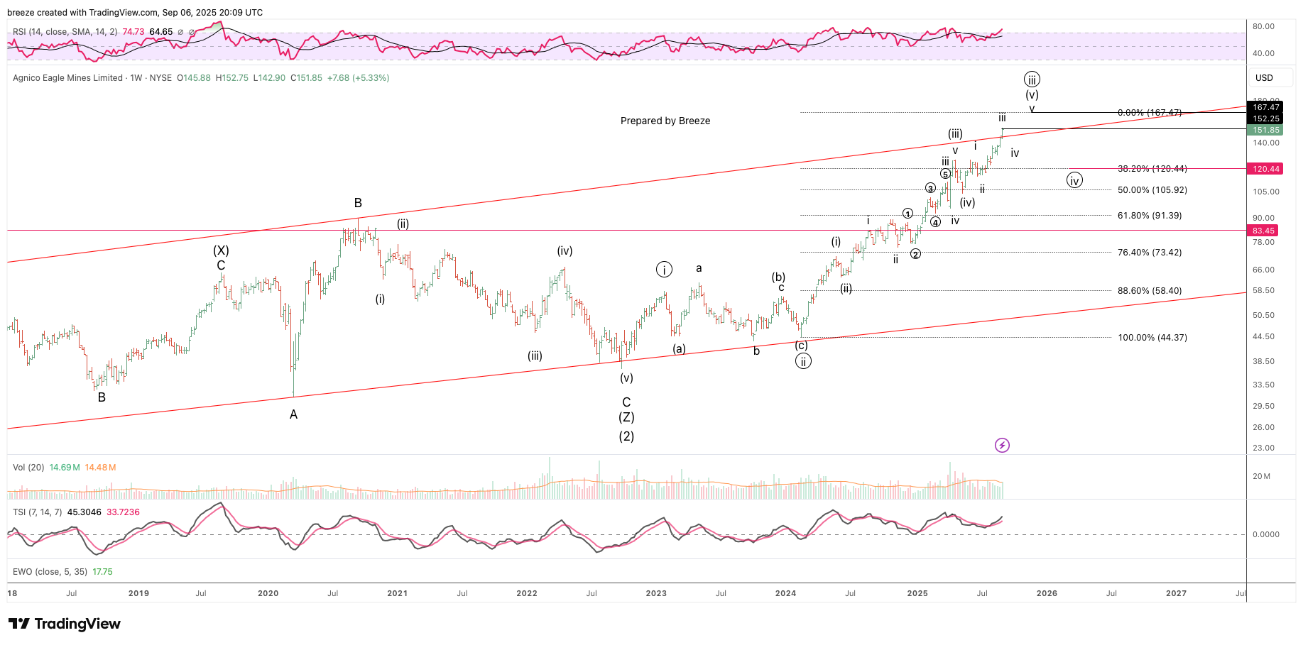 Berk, here's a AEM Wave Count Update on a Daily Chart. I refined the wave count with a projected five wave count for Wave (v) of Minute Wave (circle) iii. Once Minute Wave (circle) iii is complete expect a 38.2% retracement. Example on the chart. I'll post an AGI update later today. Breeze