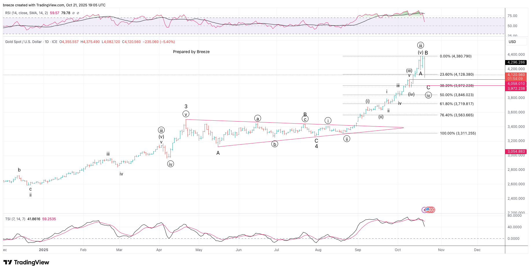 Spot Gold Wave Count Update. Minute Wave (circle) iii is complete. Minute Wave (circle) iv is in play and typically retraces to the 38.2% level. Breeze