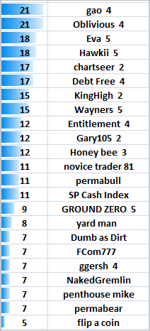 THE MARKET GURU OF THE MONTH LEADER BOARD FOR WEDNESDAY, APRIL 24TH... GURU OBLIVIOUS NOW SHARES THE LEAD WITH GURU GAO, AND GURU EVA IS IN SECOND PLACE WITH GURU HAWKII... ALL IN ALL, THIS IS A VERY TIGHT RACE TO THE FINISH...