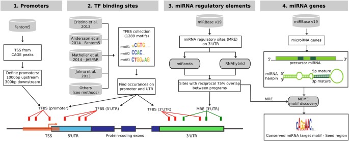 We generated overlapping predictions of TFBSs (4.8 million in 5'UTR/22.4 million in 3'UTR from 1289 DNA motifs) and MREs (2.6 million from 2042 mature miRNAs) across 59,133 untranslated regions of 19,414 genes, and used public databases of miRNA genes (miRbase v19) [ 42], transcription start sites and promoters (FANTOM5) [ 12] and enhancers (FANTOM5) [ 12] (Table 1).