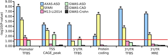 Enrichment analyses of the regulatory SNVsTo test for a general association of the regulatory SNVs with ASD, enrichment was calculated against several ASD-associated gene sets from different sources; the Simons Foundation Autism Research Initiative (SFARI) AutDB database (December 2015 update, Scores indicating any support: S,1–4) [ 47], our previously developed ASD protein-protein interaction network (AXAS-ASD), which uses ‘seed’ genes from public resources and their first-degree neighbors [ 30] and Module 13 (M13-Li2014)—a module of protein–protein interactions from Li, Shi [ 48]—which is associated with ASD risk. In addition three control datasets were retrieved from the GWAS catalog (https://www.ebi.ac.uk/gwas): (1) coronary artery disease (GWAS-CAD), (2) Crohn’s disease (GWAS-Crohn), (3) and autism spectrum disorders (GWAS-ASD).