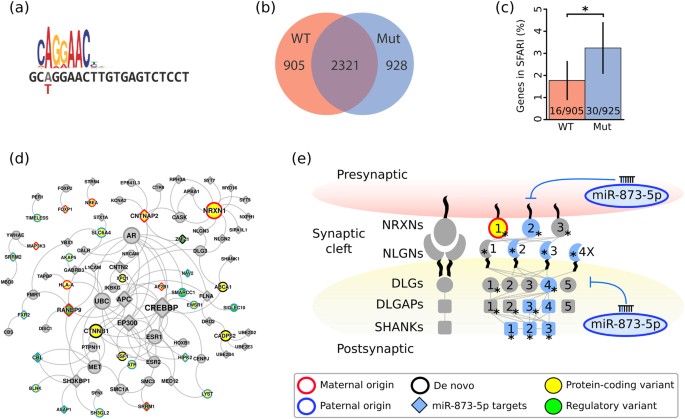 Biological significance of the miR-873 variant. a miR-873-5p showing the variant in individual f34-s1, relative to the conserved seed motif generated from predicted miR-873-5p regulatory elements with MEME [ 45]. b Venn diagram showing the overlap between genes significantly enriched in the miR-875-5p wild-type (WT) and mutant (Mut)-pulldown assays. c Percentage of the SFARI genes in genes specifically enriched in the miR-875-5p wild-type (WT) (n?=?905) or mutant (n?=?925) pulldowns – genes enriched in both pulldowns are not included. P-value calculated with chi-squared test between the groups, p-value?=?0.044, chi-squared statistic?=?4.06, and degrees of freedom?=?1. Error bars represent 95% confidence interval. Only genes present in both pulldown assays at high enough levels to have been contrasted (p-value calculated) by DEseq2 in both WT and Mutant experiments were included, omitting three genes that were significantly enriched in Mut but uncertain in WT. d Rare protein-coding and regulatory variants found in case f34-s1 overlap the AXAS-ASD network [ 30] and the miR-873-5p target genes (shown as diamonds, see Supplementary Table 6 for more details). The overlapped network shown is enriched in functional pathways associated with synaptic vesicle cycle and synaptic transmission (Supplementary Table 7). e Family f34 case study showing direct interaction of several synaptic proteins in the neurexin-neuroligin axis, in the context of the maternally inherited putative loss-of-function NRXN1 coding and the paternally inherited miR-873-5p variants in individual f34-s1. Putative target genes of miR-873-5p are shown in blue. (*) SFARI genes