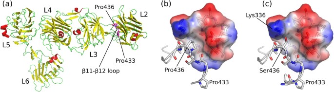 Structural modeling of the Pro429Ser NRXN1a mutation using the crystal structure of bovine NRXN1a (PDB: 3QCW). a The ß11-ß12 loops comprise of a large part of the L2-L3-LNS domain interfaces in NRXN1a. In the L2 LNS domain, the loop is characteristically bent in a horseshoe type conformation, with two proline residues Pro433 and Pro436 (magenta: equivalent to human Pro426 and Pro429) stabilizing the tightly kinked structure. b The packing of this loop in the interface involves insertion of Pro436 into a hydrophobic pocket of NRXN1a. c The Pro436Ser replacement (equivalent to Pro429Ser in humans) analyzed with the FoldX force field revealed this mutation is moderately (1.81?kcal/mol) to severely (3.18?kcal/mol) destabilizing, depending on whether Ser436 can hydrogen bond to a disordered Lys336
