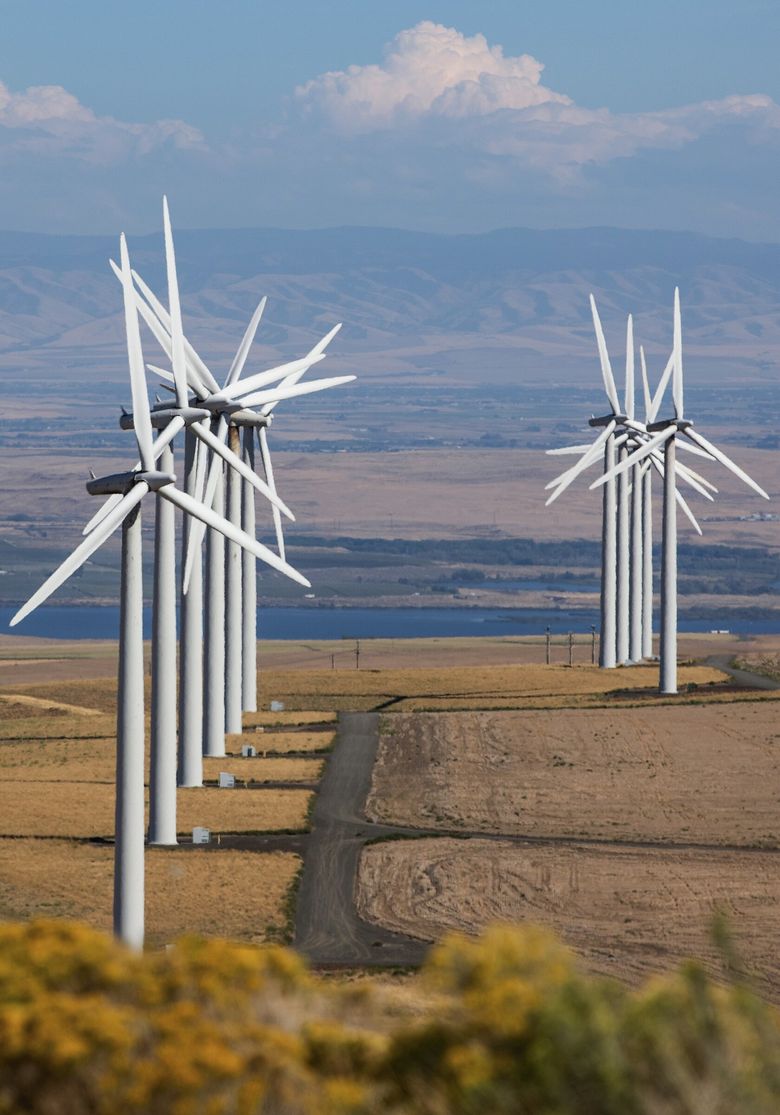 Wind  turbines dot the hills overlooking the Columbia River in Benton County.  Washington needs more clean energy to replace outgoing fossil fuel  sources and meet surging demand made worse by climate change and the  increasing prevalence of power-hungry data centers, but the latest  federal spending bill could hurt those efforts. (Luke Johnson / The  Seattle Times, 2023)