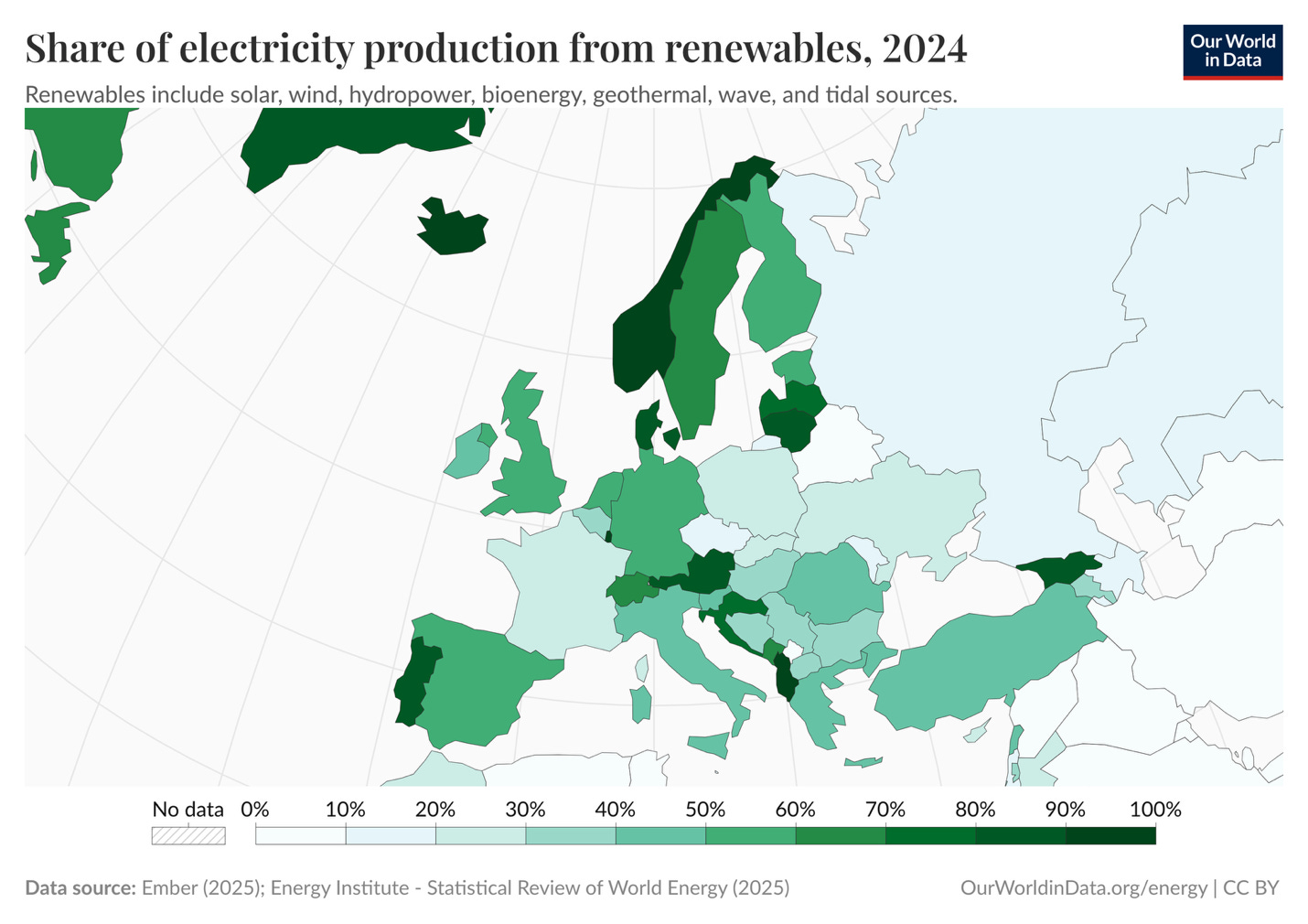 Southern Europe makes significant use of wind power, mainly onshore, but relies even more on solar power.