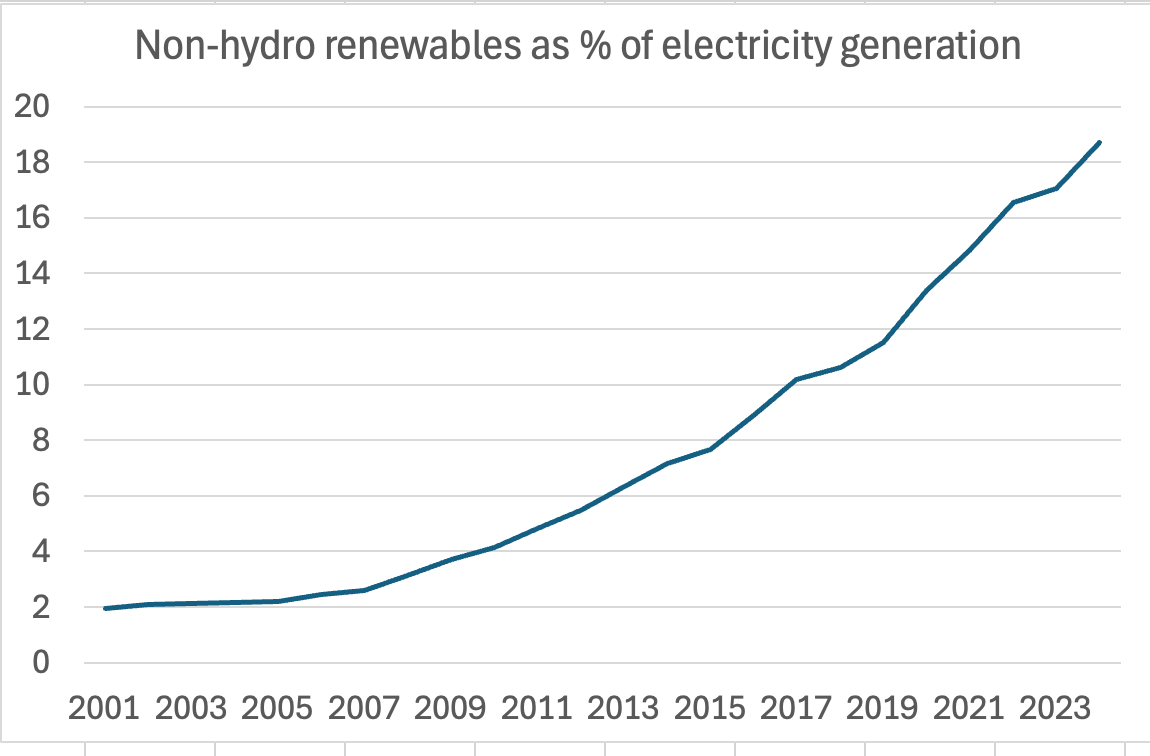 As I documented last week, since the late 2000s we’ve seen dramatic progress in three basic renewable technologies: Solar power, wind power, and batteries that address the “intermittency problem”: the fact that the sun doesn’t always shine and the wind doesn’t always blow. These “non-hydro” renewables were once considered from fringe sources of energy, dismissed as unimportant by those who considered themselves hard-headed pragmatists. Now, a mere 15 years later, solar and wind power are clearly cheaper than coal (which just isn’t competitive anymore) and price competitive with natural gas for electricity generation.