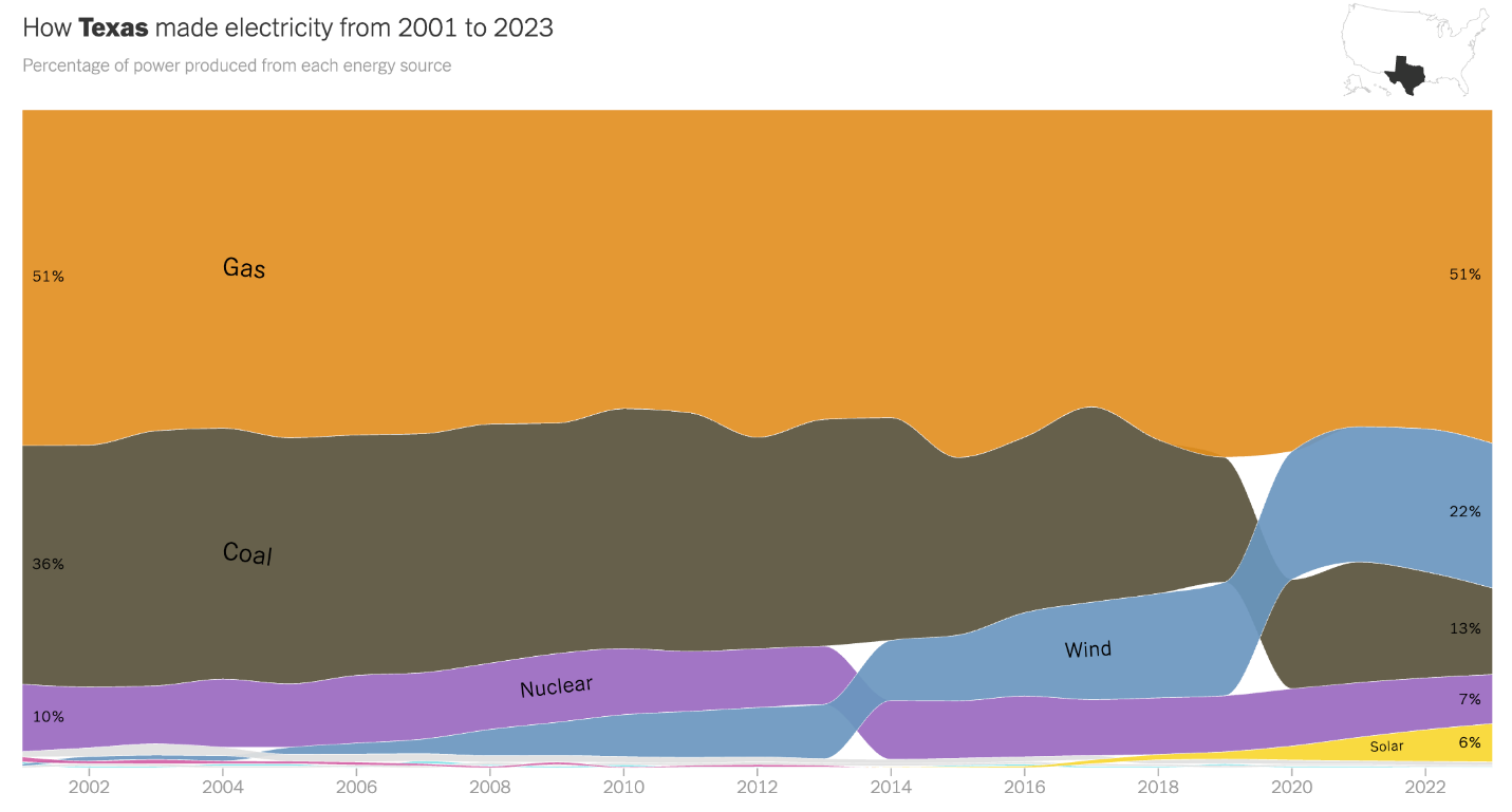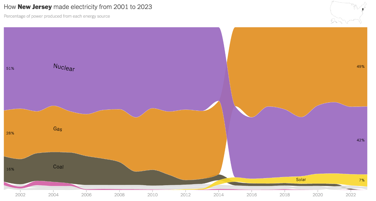 Varying degrees of left-leaning NIMBYism are surely the reason Texas, despite its political redness, gets a large share of its electricity from renewables, mainly wind, while New Jersey generates extraordinarily little renewable energy and continues to rely heavily on fossil fuels: