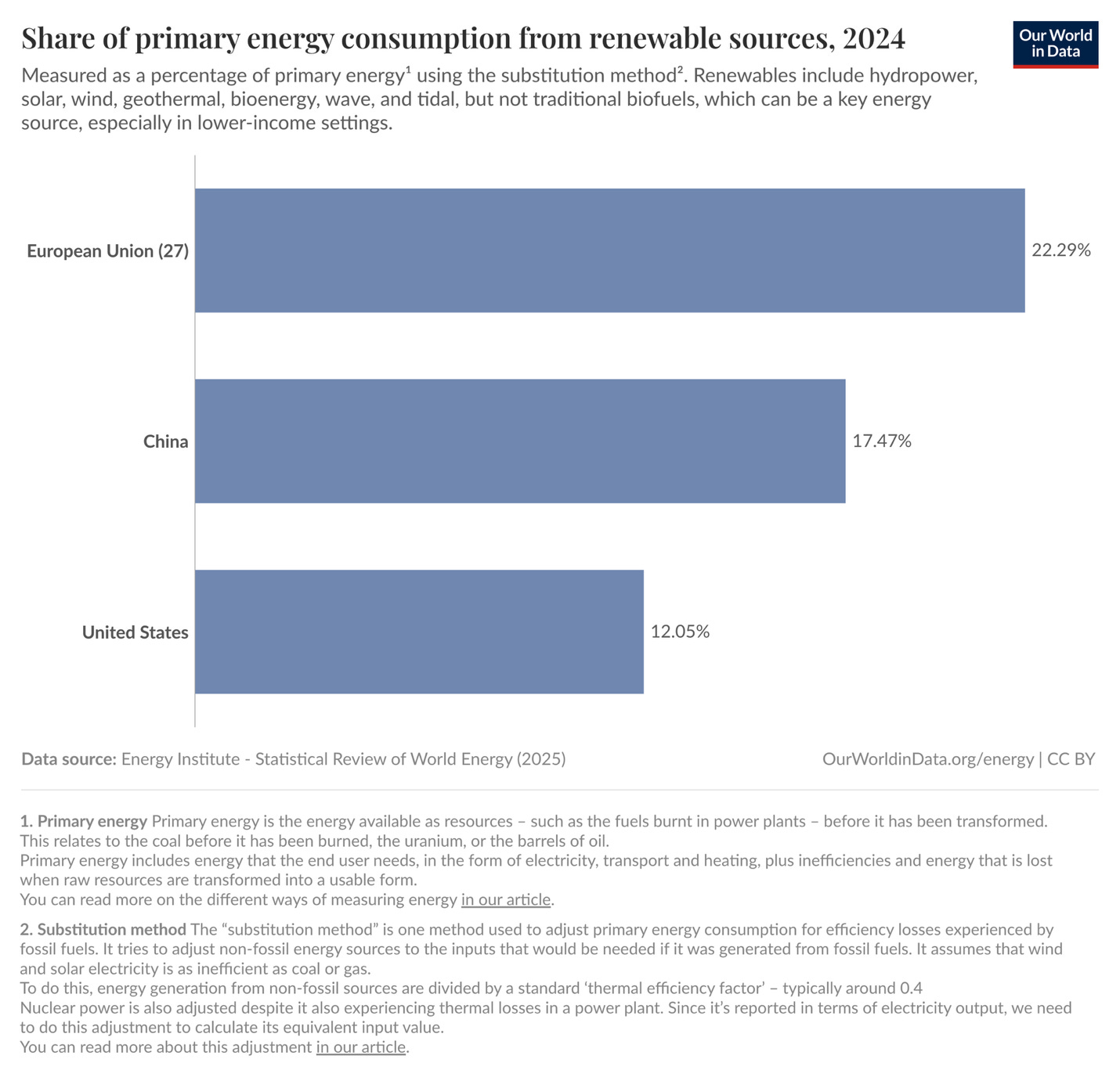 To see where things stand right now, let me offer two charts. The first shows renewables as a percentage of total energy consumption in 2024: