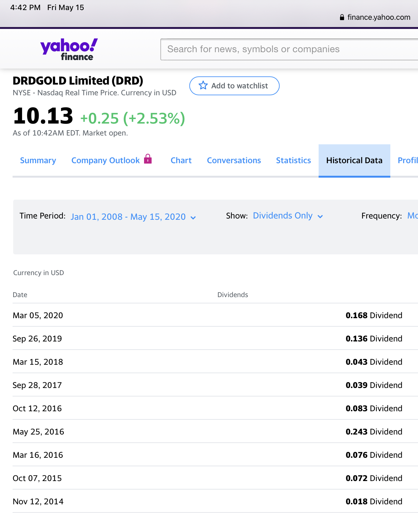 The track record is here, bit random (due mainly to exchange rate of declared dividend and its conversion to USD), but also more honest than many more ‘predictable’ companies. As gold price stays high / rises further, then, happily, presumably, more random still. As of now we seem to be on a 6-months cycle; troublesome as requires entering into ledger, but we shall bear the hassle and grin.