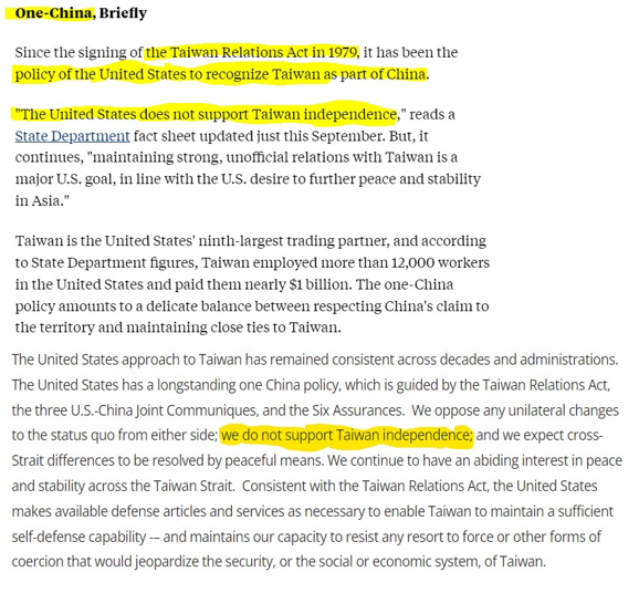 BUT ..... when you have someone like the current President of Taiwan, Tsai Ing-Wen, who has been AGITATING for Taiwan INDEPENDENCE, THEN WE HAVE SEEN CHINA MAKE IT'S "FEELINGS FELT" ON THAT SUBJECT, because that is obviously Unacceptable to China and, LIKEWISE, should be Unacceptable to the USA because of their AGREEMENT with the ONE CHINA POLICY !!!! |