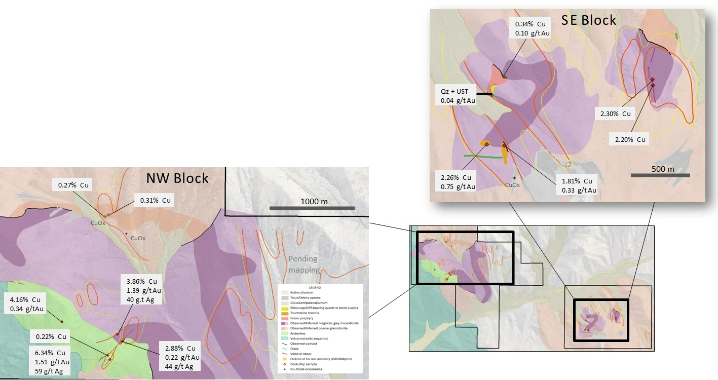 • Cu-Au porphyry vectors: epithermal veins, tourmaline breccias, and UST textures with samples up to 2.26% Cu and 0.75 g/t Au