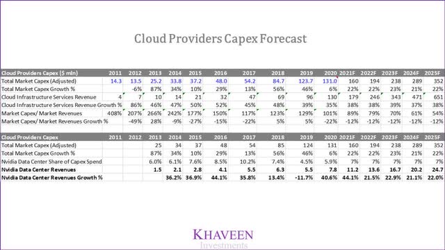 As data volume and workload grow, it gets more difficult to transmit the data. To tackle this, enterprises are expected to bring applications and storage closer to themselves rather than transporting resources to a central location. As a result, large enterprises are more likely to build on-site data storage centers which require the use of an on-site fully built server system. This is where Nvidia’s latest DGX server comes into play. To put things in perspective, these aren’t the $500 GPU chipsets used in PCs. The GPU-enabled DGX servers are provided on a subscription model, with a single one costing a massive $4.3 million a year. As to the capability of DGX, its initial design was reported to have one of the world’s fastest AI workload speeds by the National Energy Research Scientific Computer Center (NERSC). Given both the first mover and technological advantage that Nvidia has, we see the company in a prime position to capture the on-premises server market in addition to the cloud server market. As such we expect the company’s data segment revenue as a percentage of total cloud capex to continue increasing at 3%. This was derived through our calculations by first estimating the total capex by the top 4 cloud providers (Amazon ( AMZN), Microsoft ( MSFT), Google ( GOOG), Alibaba ( BABA)) and adjusted by its market share as the total cloud capex.