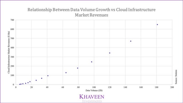 Driven by the advent of AI, HPC, IoT and edge computing, data creation is projected to grow at a rate of around23% in the next 5 years. This would require greater cloud infrastructure to handle the increase in data. To determine the growth in cloud infrastructure revenues, we identified the factor of correlation of cloud infrastructure revenues to data volume growth over the past 10 years. The factor identified of 1.65x was applied to data volume growth projections to estimate the cloud infrastructure market growth rate to the year 2025.