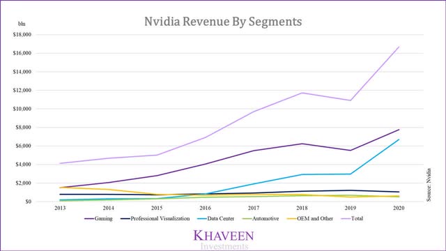 Since our previous analysis on Nvidia Corp ( NVDA), the company’s full-year revenues have increased by 53% in 2020 which has exceeded our expectations of 43% growth with higher GPU sales across PC and data center markets. As such, the company’s stock price also surges well past our previous price target of $578.39. In this analysis, we determine if its impressive growth can continue and justify a higher valuation for the company.