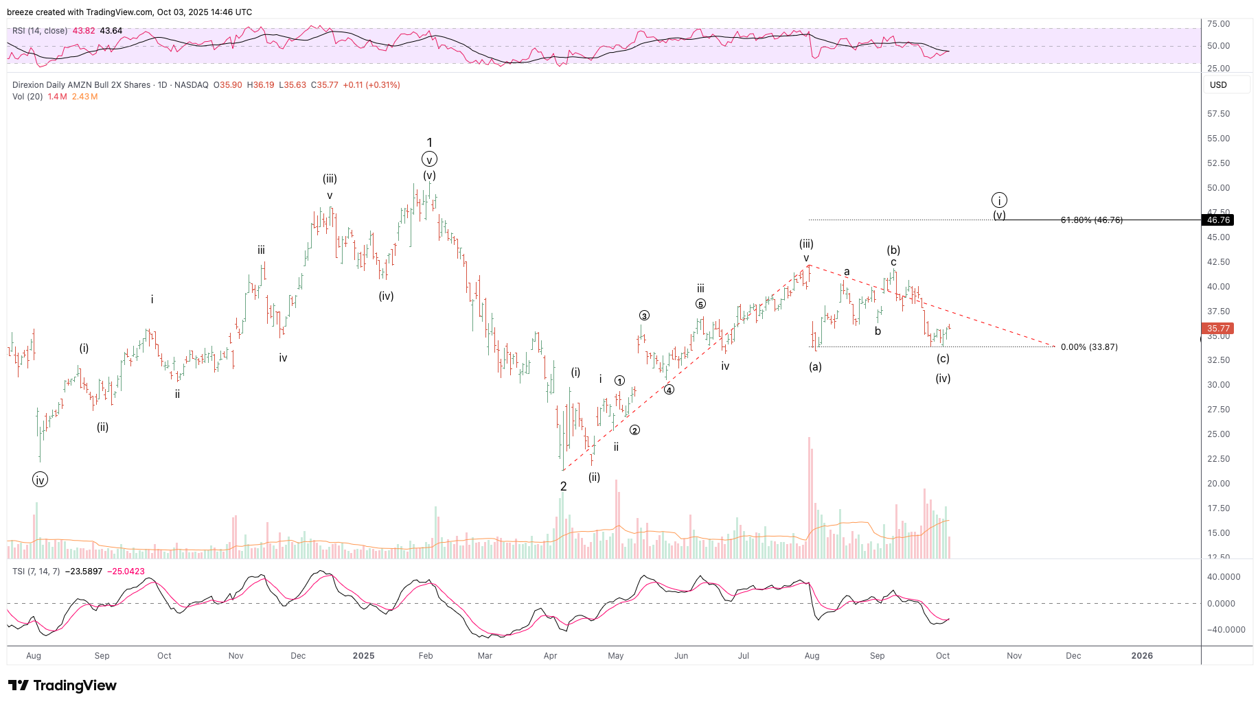 AMZU Wave Count Update. Wave (v) of Minute Wave (circle) i is in play with a target of 46.76. Breeze