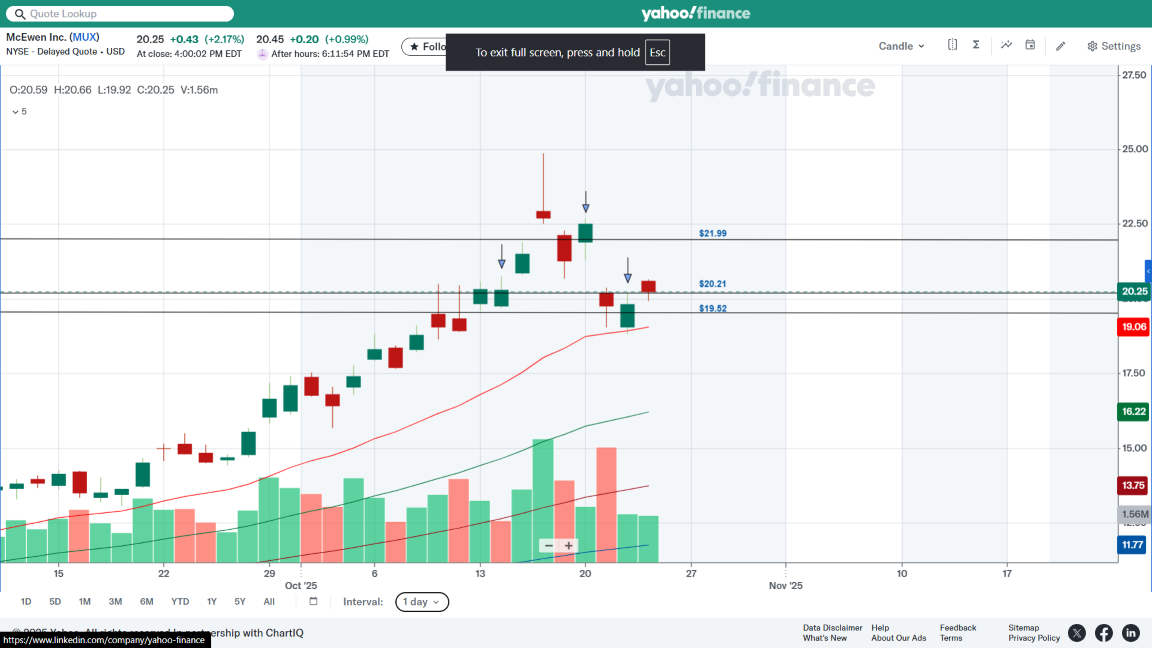 Day-1 above the lower pivot-line at $20.21, it hovered around it pretty much all of mid-day into the close on the 5 minute chart, and I'm a little spectacle, the volume could of been better, and running up to $20.66 before pulling back when gold was up well over +$75 was disappointing. I'm cautious, a dreaded head fake is not uncommon with MUX, its Friday you know, ...but, we've had some good Fridays lately too...we'll see.