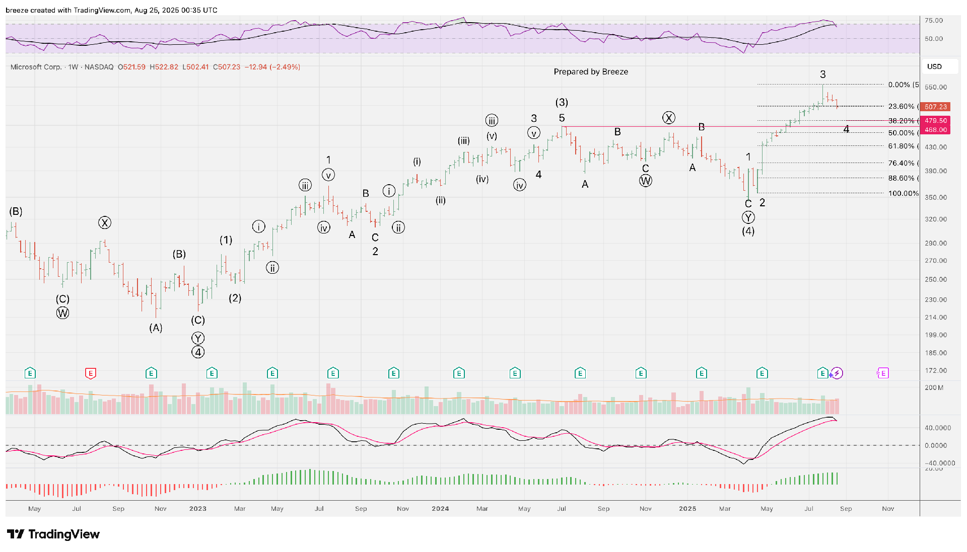 MSFT Wave Count Update. Minor Wave 4 is in play typically pullback to the 38.2% retracement level. Breeze