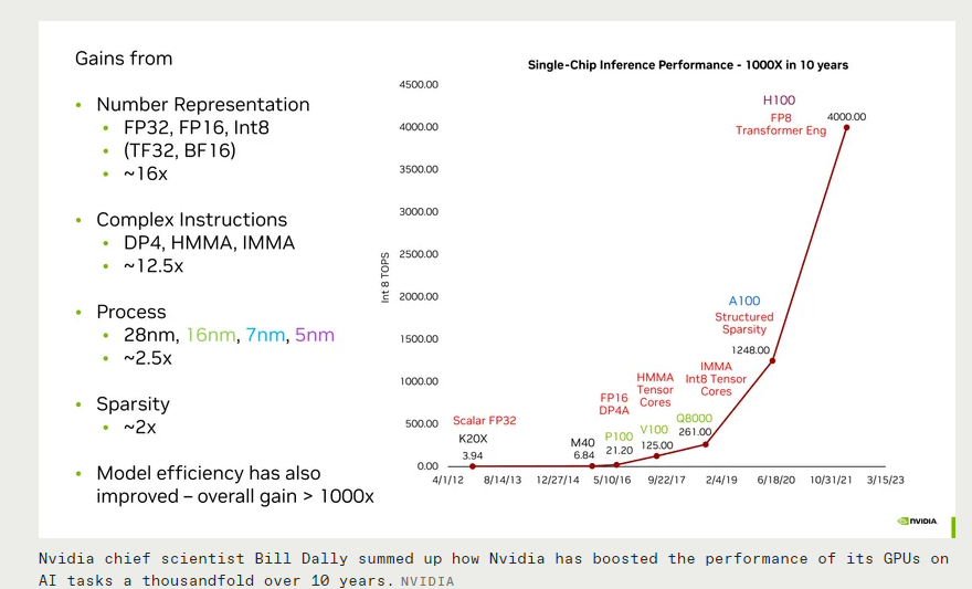 How did Nvidia get here? The company’s chief scientist,  Bill Dally, managed to sum it all up in a single slide during his keynote address to the IEEE’s  Hot Chips 2023 symposium in Silicon Valley on high-performance microprocessors last week.  Moore’s Law was a surprisingly small part of Nvidia’s magic and new number formats a very large part. Put it all together and you get what Dally called  Huang’s Law (for Nvidia CEO Jensen Huang).