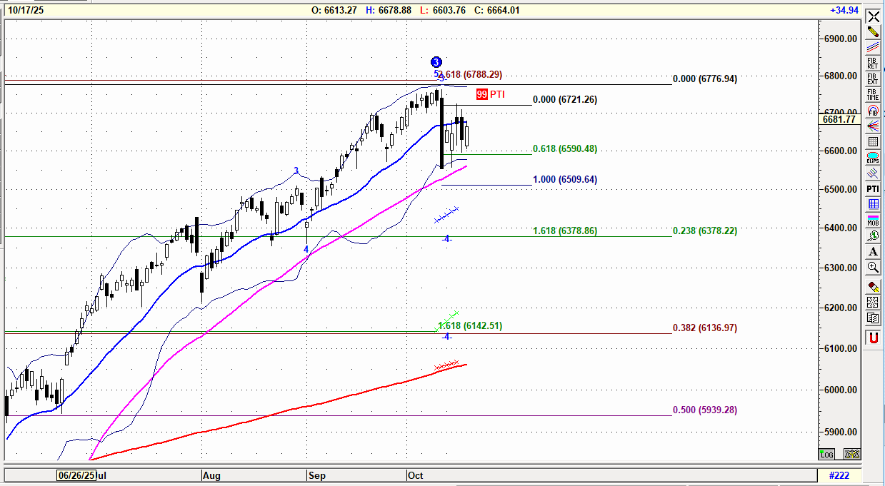 Wave 4 update 10-17-2025. Recent week trading has all but eliminated the normal algorithm wave -4- 38% target. So far, the sideways pattern has 6510 area as a key level to monitor. Notice the 23.8% wave -3- retrace at 6378 matches the 1.618 extension off the April low and matches the top algorithm wave -4- level. so that may as we get. The 200-day ma is at the lower range.