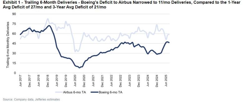 Since the beginning of 2024, Boeing’s output deficit to Airbus has narrowed by more than half, based on the average of trailing six-month deliveries, according to Jefferies analyst Sheila Kahyaoglu.