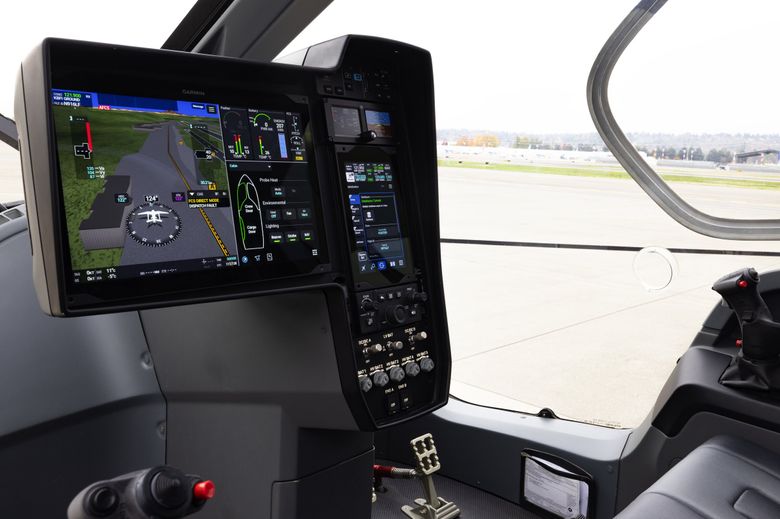 The pilot’s display on the flight deck is seen as BETA Technologies exhibits one of its fixed-wing all-electric aircraft at King County International Airport-Boeing Field on Tuesday in Seattle. (Ken Lambert / The Seattle Times)