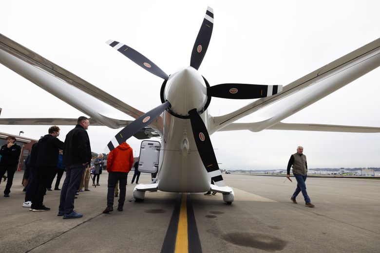 Beta Technologies’ all-electric passenger plane is powered by one electric motor and one five-blade propeller. (Ken Lambert / The Seattle Times)