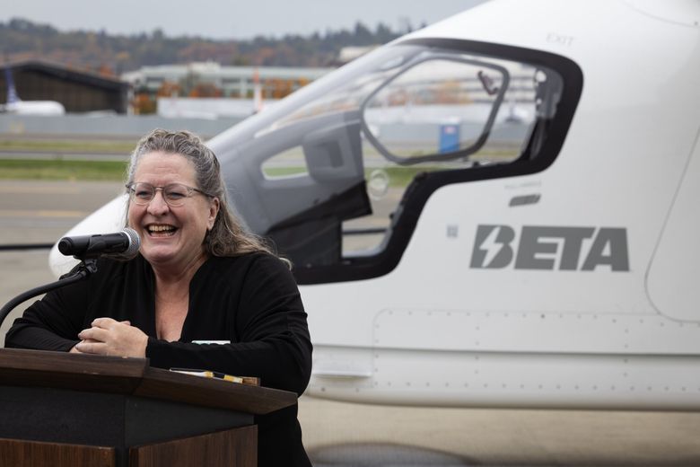 Ann Richart, Aviation Director, Washington State Department of Transportation, speaks at an event where BETA Technologies exhibits one of its fixed-wing all-electric aircraft at King County International... (Ken Lambert / The Seattle Times)