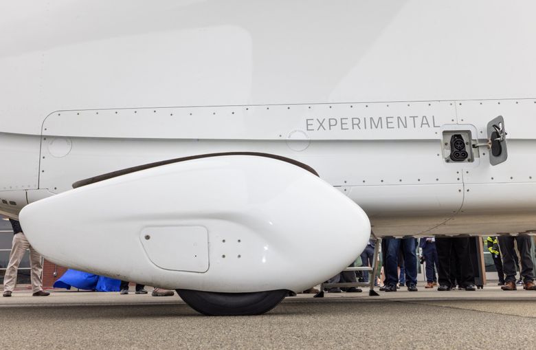 The recharge port is seen at right, as BETA Technologies exhibits one of its fixed-wing all-electric aircraft. (Ken Lambert / The Seattle Times)
