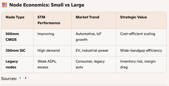Yes—STMicroelectronics (STM) saw stronger performance from smaller-node chips, especially 300mm silicon and 200mm silicon carbide (SiC), which are central to its strategic pivot. Larger-node legacy products faced pricing pressure and inventory buildup, contributing to recent losses.