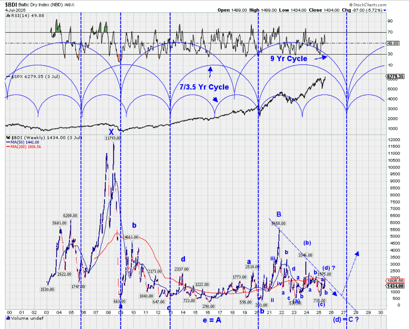 • For this to remain valid, the BDI has to trend down here, from the putative (d). And if that happens, we could get a slightly higher low relative to the (c), awa a probable early ending. The triangle looks to be slightly contracting. And then the BDI would take off, probably head to a new ATH.
