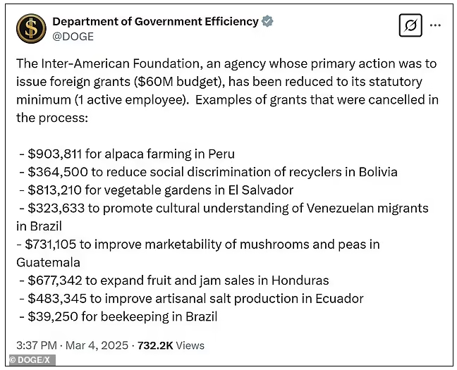 DOGE announced on Tuesday that the Inter-American Foundation has been slashed in accordance with an executive order the president signed last month deeming it 'unnecessary.'