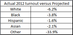 Different groups stayed home at different rates. White turnout in 2012 was 6.2 percent below projections (5.5 percent using Teixeira and Abramowitz’s alternate projection of white voters); African-American turnout was 3.8 percent below projections; and so forth. Moreover, the number of “missing” Hispanics and Asians is probably overstated. As I noted, my projected turnout calculations don’t account for the disproportionate share of the “new” adults in these groups who were non-citizens, and I’m assuming a higher rate of voter participation (55 percent) than we see from these groups. As I also noted, the large mass of missing “other” voters is probably a rounding issue. This isn’t a minor point; those voters represent 60 percent of all the non-whites that Teixeira and Abramowitz are discussing.