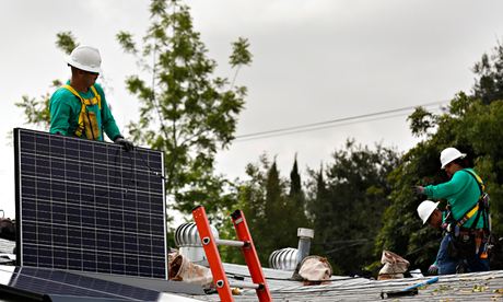 SolarCity Corporation employees install solar panels on the roof of a home in a Los Angeles neighbourhood in California, US. Photograph: Patrick T Fallon/Getty Images