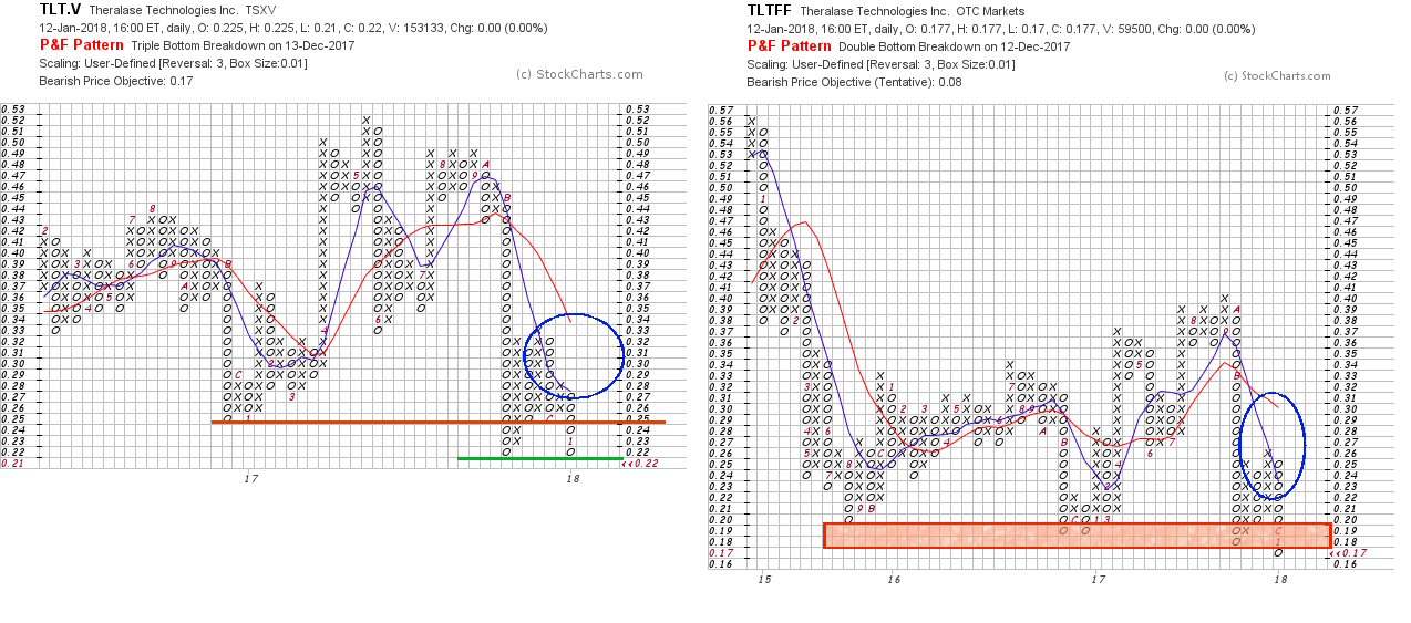 In the blue circles you see TLT.V dropped to $0.20/share and TLTFF dropped to about $0.15 briefly.... Why is this not shown in the P&F charts??? It is because the P&F charts are based on CLOSING values... not low values.... at least they are for my charts... there are options to base charts on Hi/Lo numbers but I have found no advantage using such charts