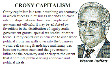 ...Buffett is now at the center of another tax controversy, according to The Wall Street Journal. His recent decision to invest in Bank of America “represents another tax-avoidance triumph for the Berkshire chief executive,” the Journal wrote in an editorial ... “With the exclusion for Mr. Buffett and his fellow shareholders, Berkshire will enjoy an effective tax rate of 14.175% on the $300 million in dividends it will receive each year from Bank of America,” the Journal reported. [Remember, his secretary pays a higher tax rate?]. Look up "crony capitalist" in the dictionary and I'll bet you see a lithograph of Warren Buffett staring back at you