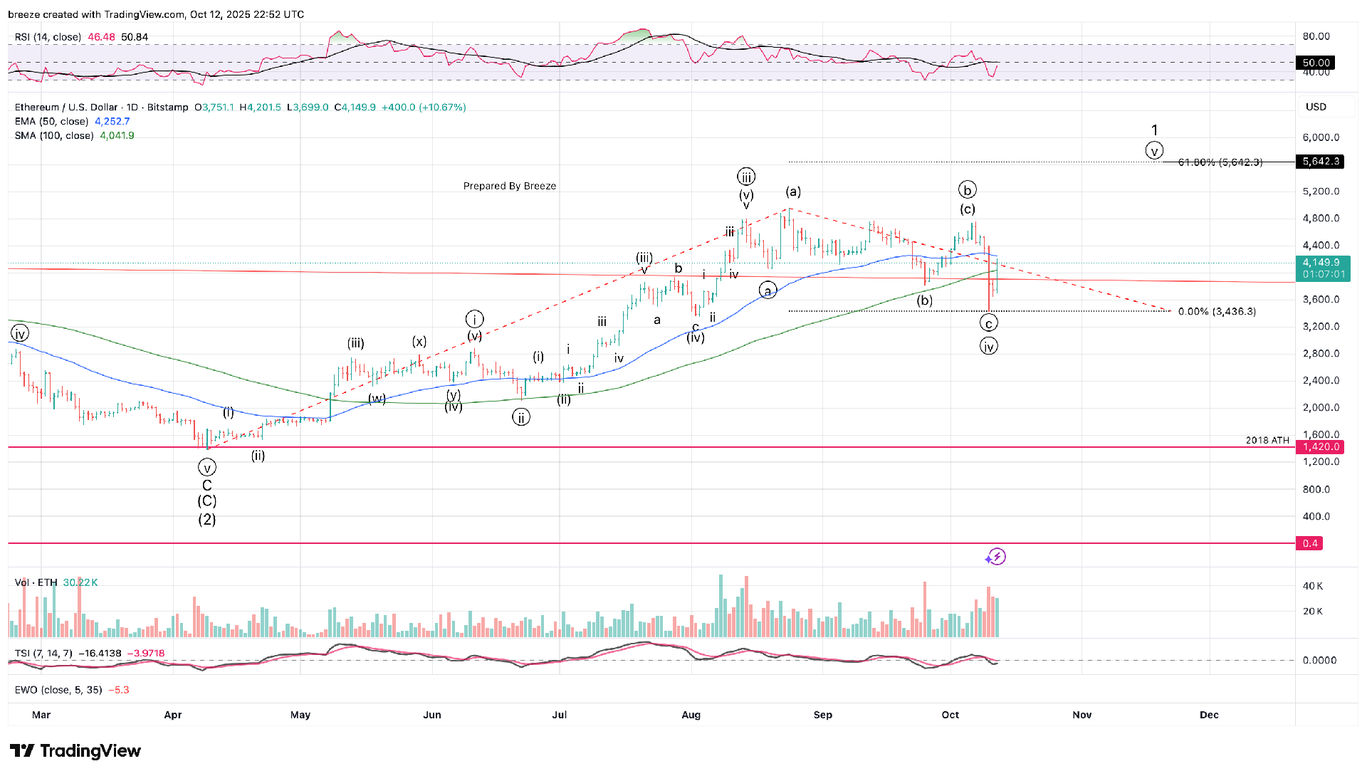 ETHUSD Wave Count Update. Minute Wave (circle) iv appears complete. If so then Minute Wave (circle) v of Minor Wave 1 is in play with a target of 5,642. Breeze