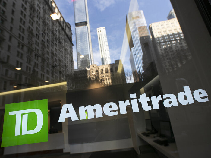 The logo for TD Ameritrade appears on an office window for the company. Trading apps are seeing a boom in customers as people flock to trading stocks during the pandemic. Mark Lennihan/AP hide caption