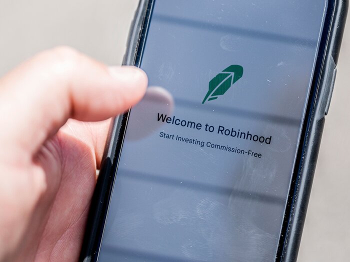 The Robinhood investment app appears on a smartphone in this photo illustration. Day trading has surged during the coronavirus pandemic as stay-at-home people try buying and selling stocks, often for the first time.
