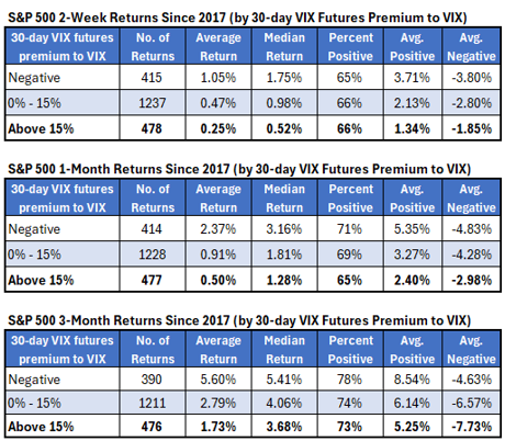 The chart below tracks the S&P 500 back to 2017, with orange markers highlighting times that the 30-day VIX futures were at a 15% premium to the VIX. Eyeballing this chart, it seems this signal occurs during uptrends and at short-term peaks. In this week’s article, I’ll quantify what typically happens after these signals to get a better idea of what may lie ahead.