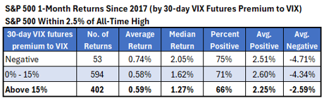 I ran the same analysis as above, but I wanted to see anything changed if I only considered times the S&P 500 was within 2.5% of an all-time high, our current situation. The table below summarizes the one-month returns. Comparing the average returns in this table to the 1-month returns in the table above, it shows the S&P 500 has lower returns in the first two rows of the data. When the VIX futures premium is in the most normal range (0% - 15%), the average return of the S&P 500 goes from 0.91% anytime down to 0.58% when the index is near an all-time high. Our current situation -- in which the VIX futures premium is high -- the S&P 500 has performed better when it’s near an all-time high compared to other times. The average return over the next month goes from 0.50% anytime to 0.59% when near an all-time high.