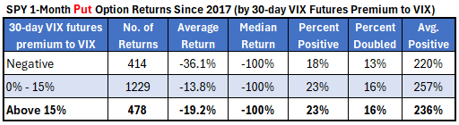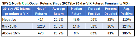The table below shows how one-month call options have performed on the SPY since 2017 based on the 30-day VIX futures premium. With the strong market overall, call options have been outstanding. Interestingly, the average call option returns are very similar across all three buckets even though the S&P 500 itself tends to underperform with an elevated VIX futures premium. This is because the high VIX premiums primarily occur in low VIX environments. This means options are cheap and a smaller move is necessary to generate a similar return for an option. When the VIX futures premium has been above 15%, call options have had the highest average positive return of 135% and it also shows the highest percentage of option returns that doubled, although all three brackets are similar in this regard.