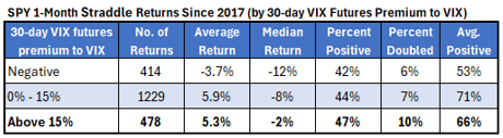 This last table shows the performance of purchasing SPY straddles based on the VIX futures premium. A straddle means purchasing an at-the-money call option and put option so that you can profit no matter which way the index moves. However, to earn a profit, the move must be significant so that it can cover the premium of both options. Straddles have been profitable on average since 2017 when the VIX futures premium were at current levels. It was only when the VIX futures premium was negative that straddles were not profitable on average.