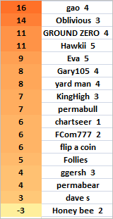 THE MARKET GURU OF THE MONTH LEADER BOARD FOR THURSDAY MARCH 15TH... GAO STILL HOLDS THE LEAD NOW WITH OBLIVIOUS CLOSE BEHIND!!! HONEY BEE IS STILL SUCCESSFULLY PROTECTING HER LEAD FOR THE HIGHLY COVETED BOOBY PRIZE OF THE MONTH... THE STAMPEDE TO THE TOP (AND THE BOTTOM) OF THE LEADER BOARD IS ON!!!