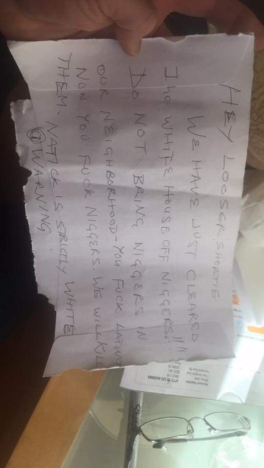 “WE HAVE JUST CLEARED THE WHITE HOUSE OFF N****RS!!!!” a handwritten note received on Nov. 10 said. “DO NOT BRING N****RS IN OUR NEIGHBORHOOD—YOU FUCK LATINOS NOW YOU FUCK N****RS. WE KILL THEM.”